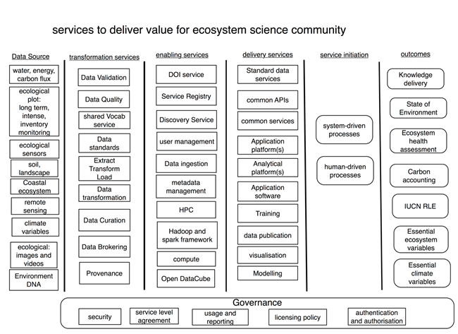 The data e-infrastructure should also move towards big data technologies as drivers to deals with the increase in data production by different data observing initiatives and need to provide coherent eResearch platform to provide services for research data management and cross-disciplinary collaboration with flexible governance model. In ecosystem science, this should enable access to large collection of earth, environment, biodiversity datasets that support regional, continental and global issues and policy matters, while supporting on-demand compute and storage need for data-centric scientific applications; secure environment for data storage and processing; policy to support data security, privacy and confidentiality; authentication and authorisation to support virtual collaboration and building scientific communities.