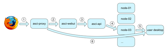 ASCI consists of a cluster of high performance compute nodes and a number supporting applications. These include an application for launching and managing instances (asci-api), a web interface (asci-webui) and a proxy for relaying connections (asci-proxy).