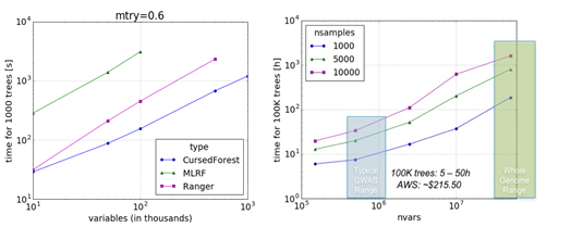 We have compared the performance of CursedForset on genomics datasets against other leading implementation and tested its ability to scale on very large datasets. The results demonstrate not only that CursedForset is the single implementation able to process the WGAS-size datasets but also that it significantly outperforms other methods on smaller datasets.