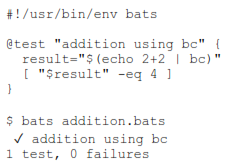 BATS (Bash Automated Testing System) [1] is a TAP (Test Anything Protocol) [2] compliant testing framework for Bash. It provides a simple way to verify the functionality of the executing programs. The test uses BATS files, which are essentially Bash scripts with special syntax for defining the test cases. If every command in a test case exits with a 0 status code (success) the test is considered as passed. See an example run below: