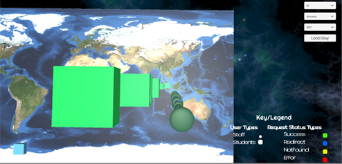 The data was anonymised to protect client confidentiality whilst retaining granularity. The number of lines in the log file were reduced by removing ‘noise’. The Unity3D[4] software was chosen for its ability to provide visualisations that could be displayed on the large screens of the HIVE but also desktop screens. Many possibilities were discussed for visualisations that might give insight into client behaviour, but two were chosen for the internship.